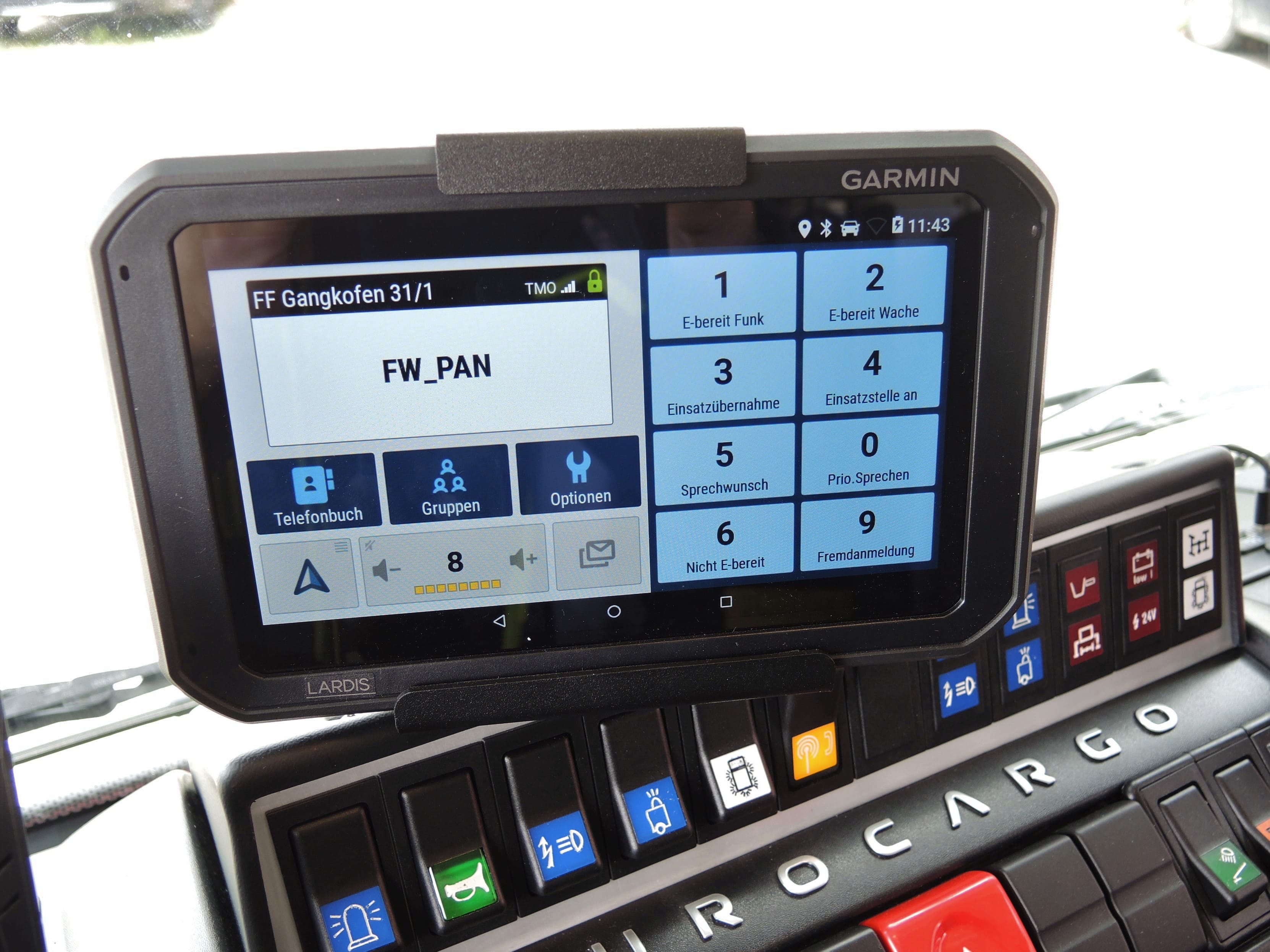 Da unsere Drehleiter immer wieder auch überörtlich im Einsatz ist, haben wir dieses Fahrzeug nun als erstes mit einem LARDIS:ONE ausgerüstet. Dabei handelt es sich um ein Navigationssystem, das mit dem BOS-Funk des Einsatzfahrzeugs gekoppelt ist. Dadurch kann es von der Leitstelle die Koordination des Einsatzortes empfangen und sofort die Route dorthin berechnen.