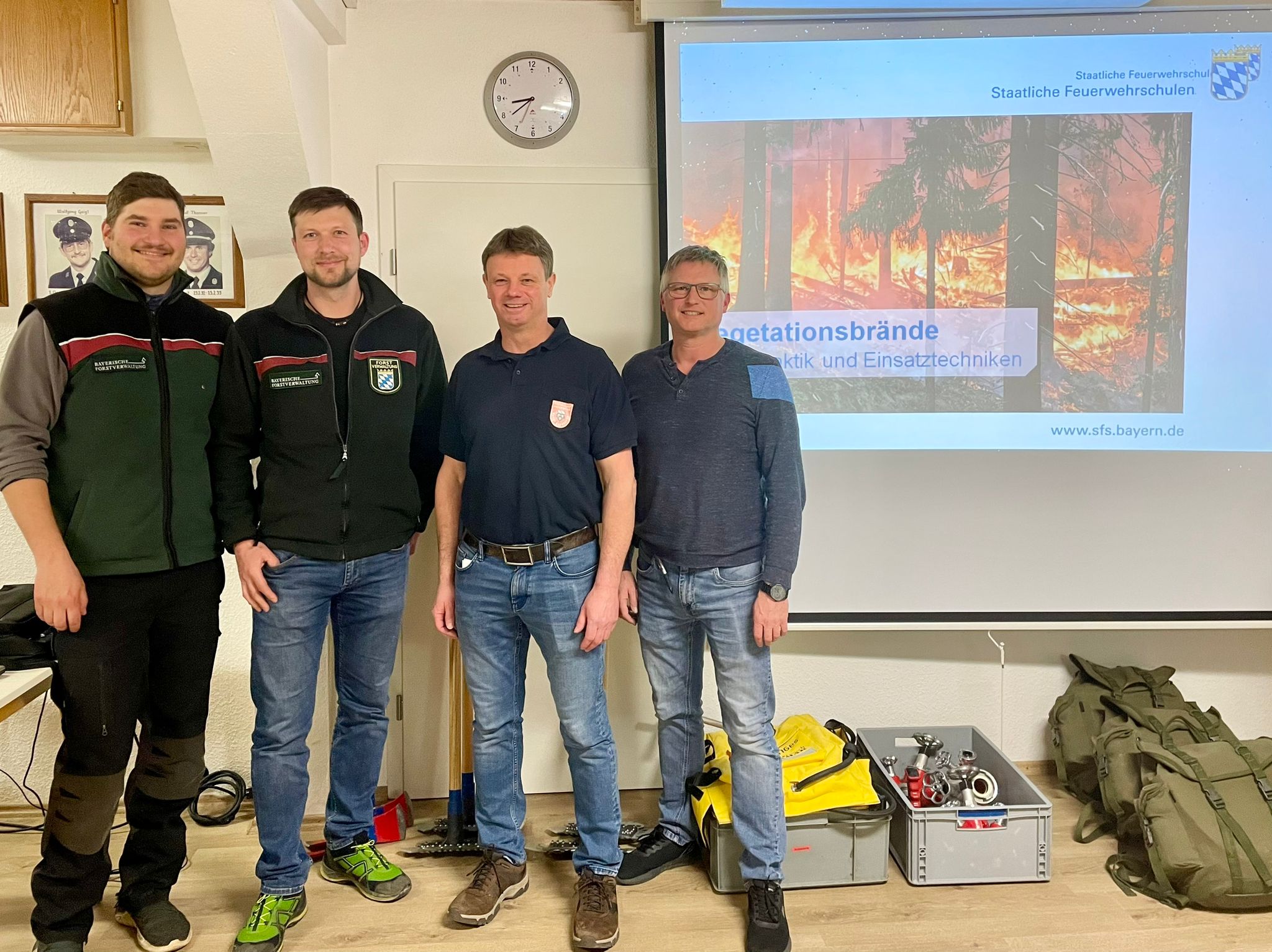 Deshalb hat es uns sehr gefreut, dass wir beim letzten Übungsabend zwei Gastdozenten zu diesem Thema begrüßen durften. Lukas Plechinger und Christoph Bader vom Forstamt Pfarrkirchen sind unter anderem für unseren Gemeindebereich zuständig und informierten uns, welche Maßnahmen und Möglichkeiten es beim Thema Waldbrandbekämpfung von Seiten des Forstamtes gibt. Zukünftig werden auch gemeinsame praktische Übungen durchgeführt, um zu prüfen, wie wir uns im Einsatzfall gegenseitig unterstützen können.