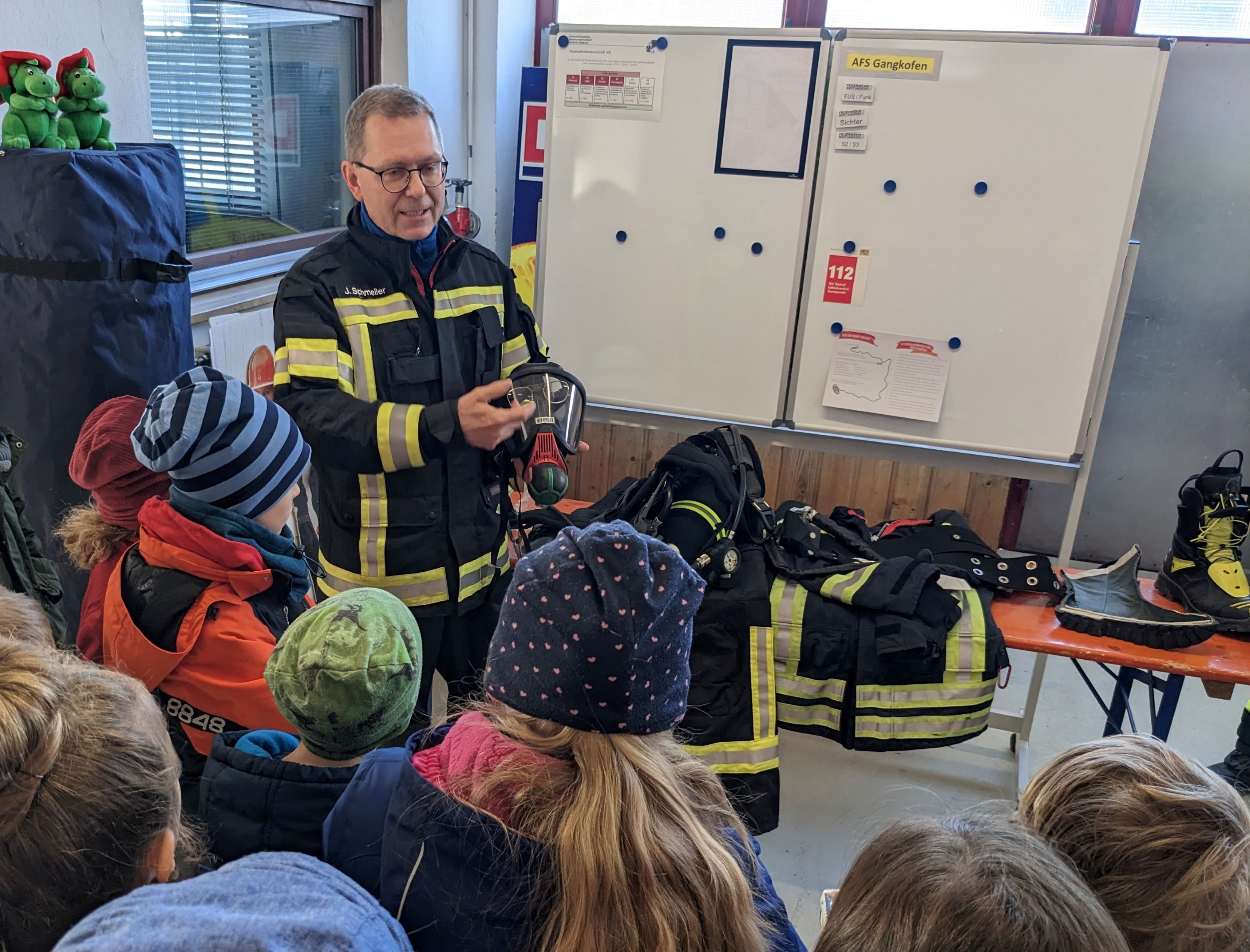 Höhepunkt war dann der Besuch vor Ort der pro Klasse ca. zwei Schulstunden in Anspruch nahm. Die Feuerwehrkameraden Marko Hain, Andreas Huber und Jürgen Schmeller opferten gerne Ihren Vormittag, um den kleinen „Grisus“ die ehrenamtliche Tätigkeit Ihrer Feuerwehr näher zu bringen. Begonnen wurde mit einem kleinen theoretischen Teil, bei dem nochmals die Einsatzkleidung gezeigt wurde. Wer Lust hatte konnte das Tragen eines Atemschutz-gerätes ausprobieren. Schwerpunkt war das Verhalten im Brandfall, gemeinsam wurden die fünf „W-Fragen“ erarbeitet die beim Notruf notwendig sind aber schon richtig gut beherrscht wurden. Viele interessierte Fragen wurden den Feuerwehr Kameraden gestellt.