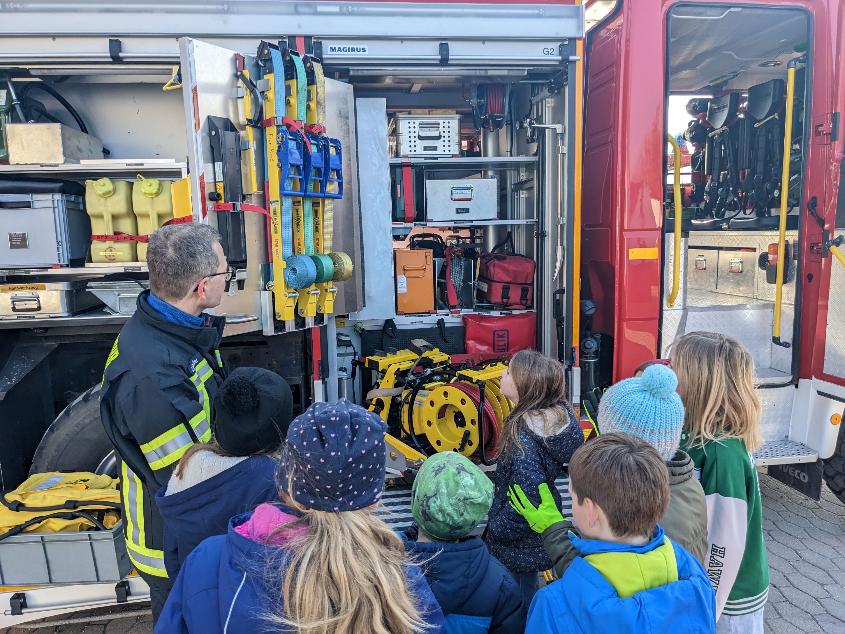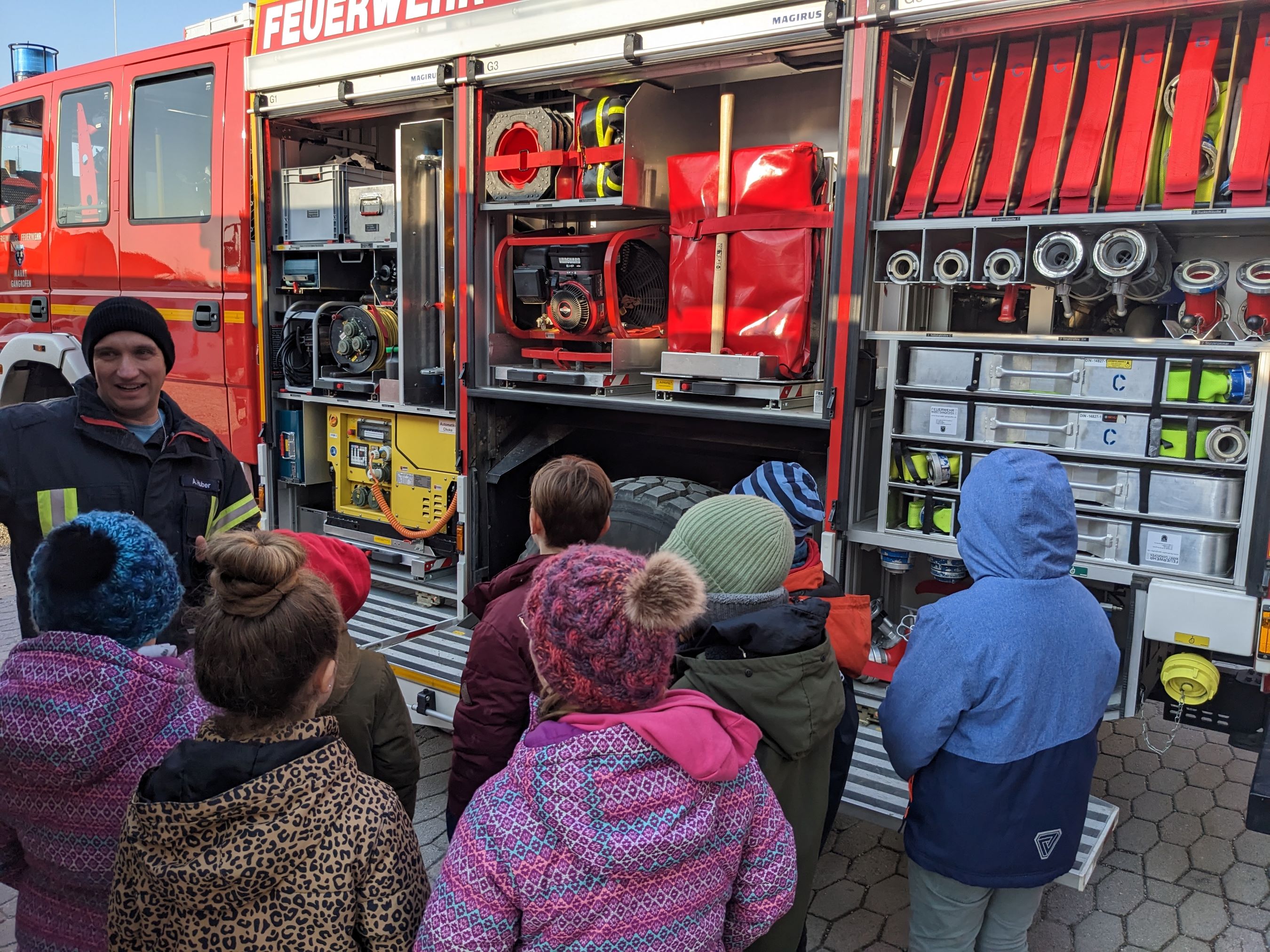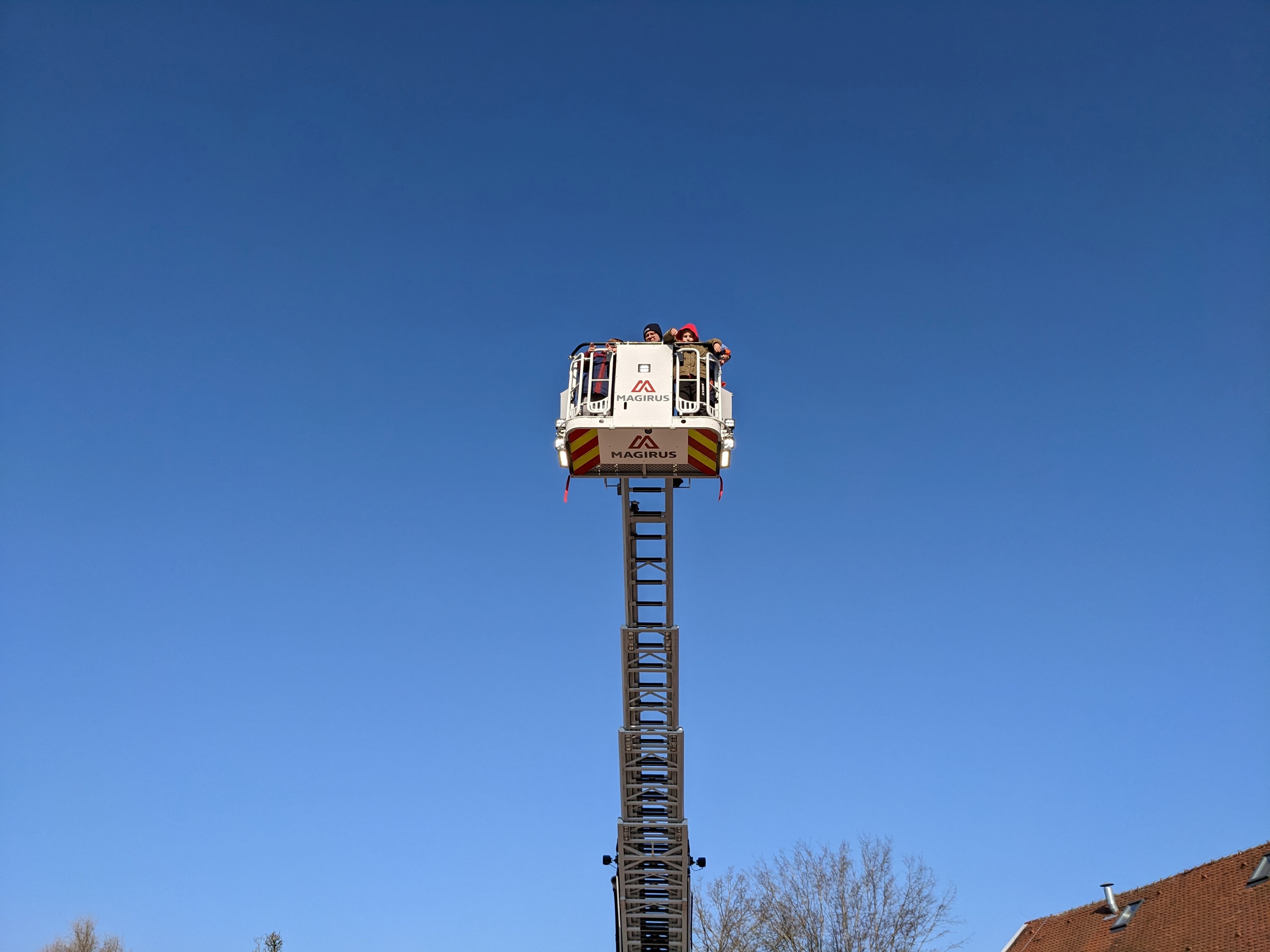 Im Anschluss wurden aufgrund der Klassengröße drei Gruppen gebildet und die Ausstattung der einzelnen Fahrzeuge mit den vielen Gerätschaften vorgeführt. Vom Strahlrohr über Stromerzeuger bis hin zum Rettungsspreizer wurden interessiert begutachtet. Einmal dort sitzen, wo im Einsatz der Gruppenführer oder der Maschinist sitzt in einem großen Fahrzeug machte großen Spaß. Große Freude kam auf in dem die Schülerinnen und Schüler ein kleines Stück im Korb der Drehleiter Ihre Lehrerinnen von oben betrachten konnten.