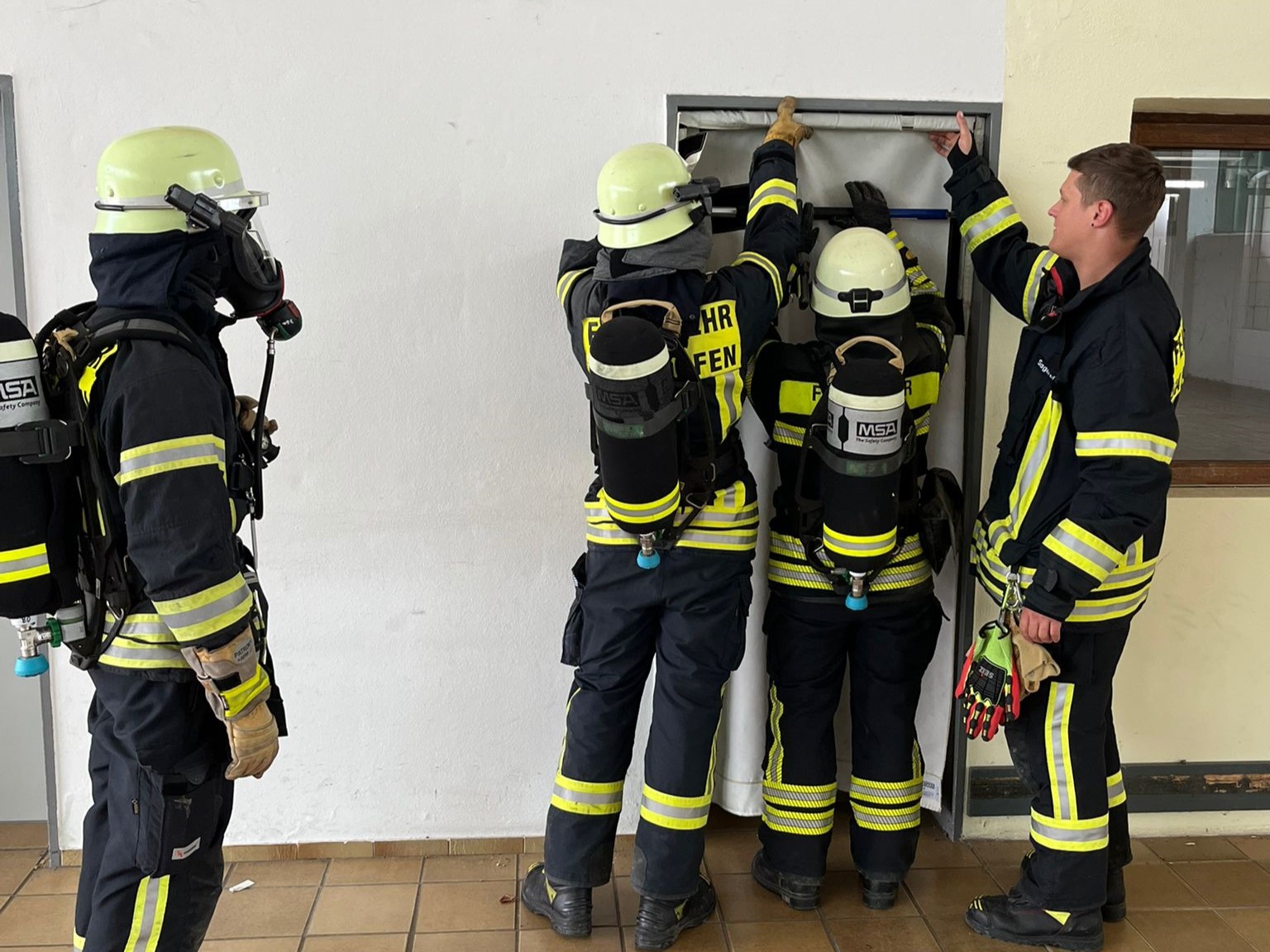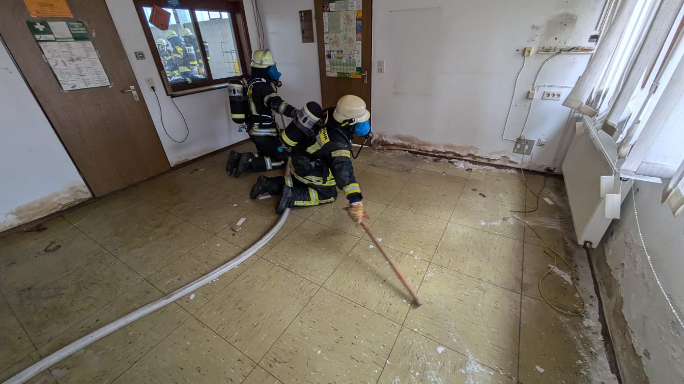 Neben verschiedenen Stationsübungen, zur Personensuche, der richtigen Türöffnung, Rauchschutzvorhang und dem Vorgehen bei Mayday-Lagen lag der Hauptfokus auf dem Thema Einsatzstellenhygiene. Zunächst wurden die Schritte in einer kurzen Präsentation theoretisch besprochen und im Anschluss an die Stationsübungen in der Praxis beübt.