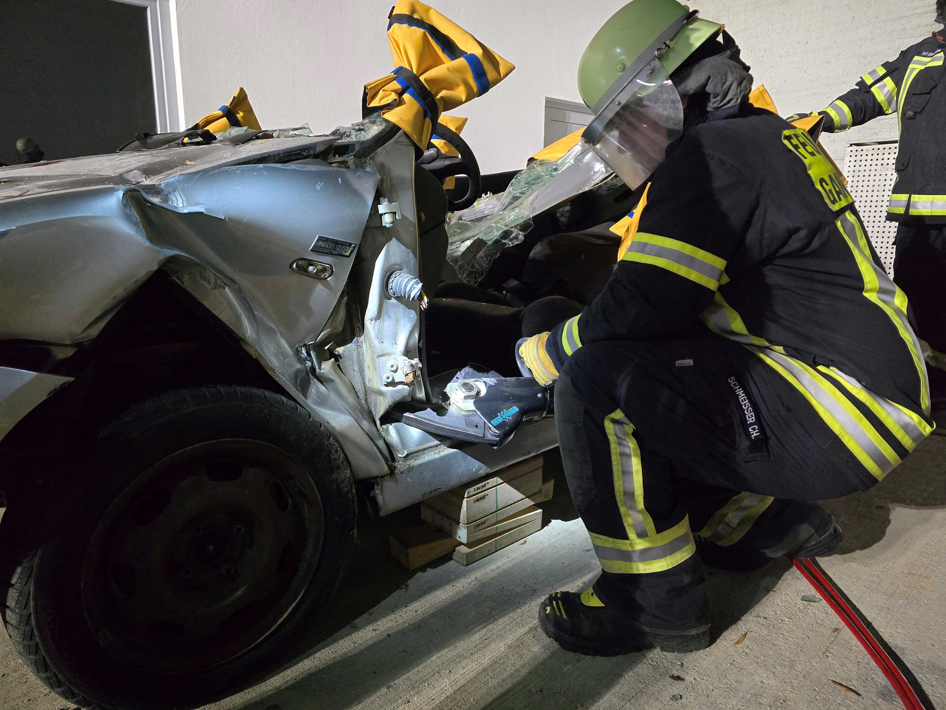 Dabei wurden verschiedene Herangehensweisen zur Befreiung einer Person aus einem verunfallten PKW besprochen und anschließend mit hydraulischem Rettungsgerät – Schere und Spreizer – praktisch umgesetzt.