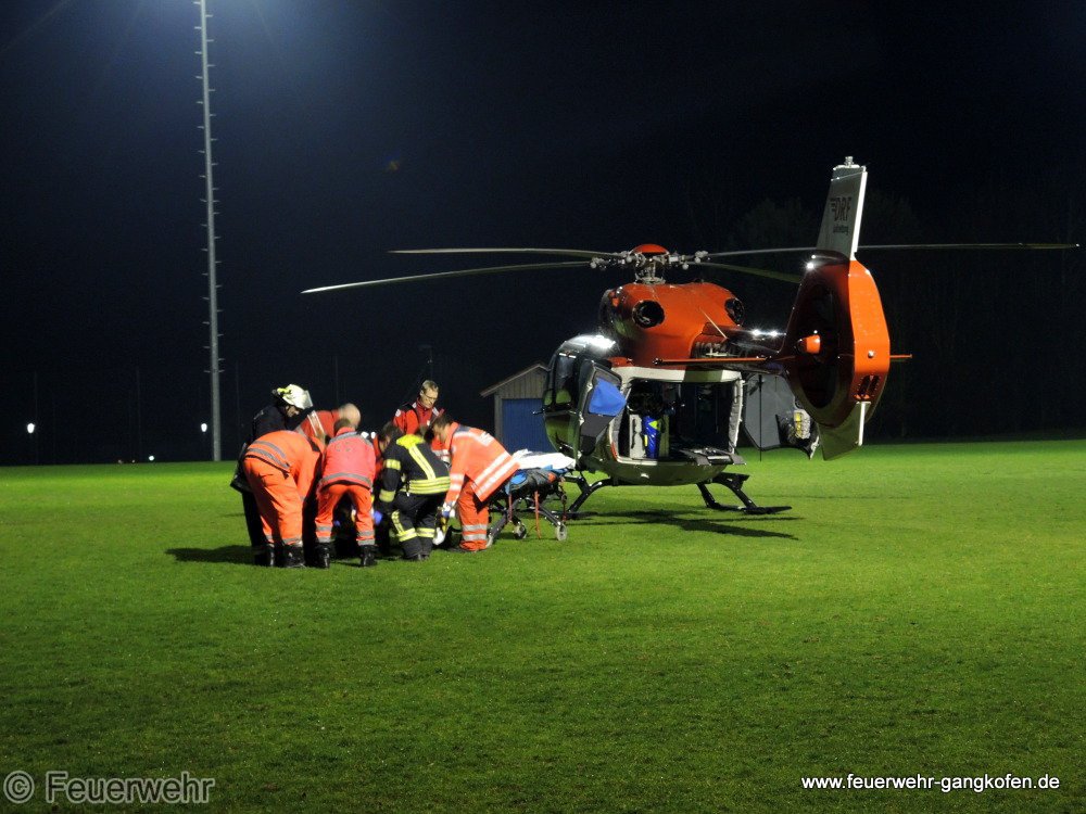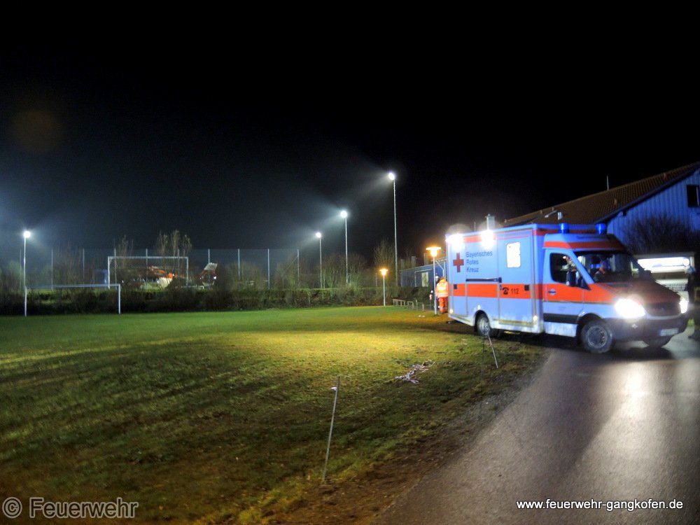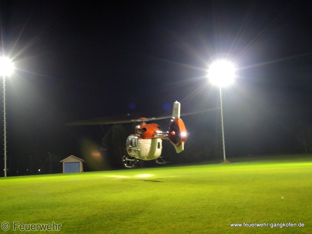 Unterstützung des Roten Kreuzes bei einer Personenrettung aus dem 1. OG. TLF und DLK waren an Einsatzstelle zur Personenrettung über die DLK. Der Patient wurde mit Rettungswagen zum Hubschrauberlandeplatz Sportplatz gebracht. Am Landeplatz wurde vorsichtshalber das HLF zwecks Ausleuchtung platziert - es konnte aber das Flutlicht des Fußballplatzes eingeschaltet werden.