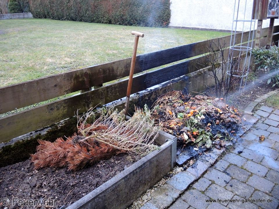 Glutreste entzündeten einen Komposthaufen und Teile eines Gartenzauns. Der Entstehungsbrand konnte von Anwohnern rasch eingedämmt werden, die FFW Gangkofen kontrollierte anschließend mit der Wärmebildkamera auf Glutnester.