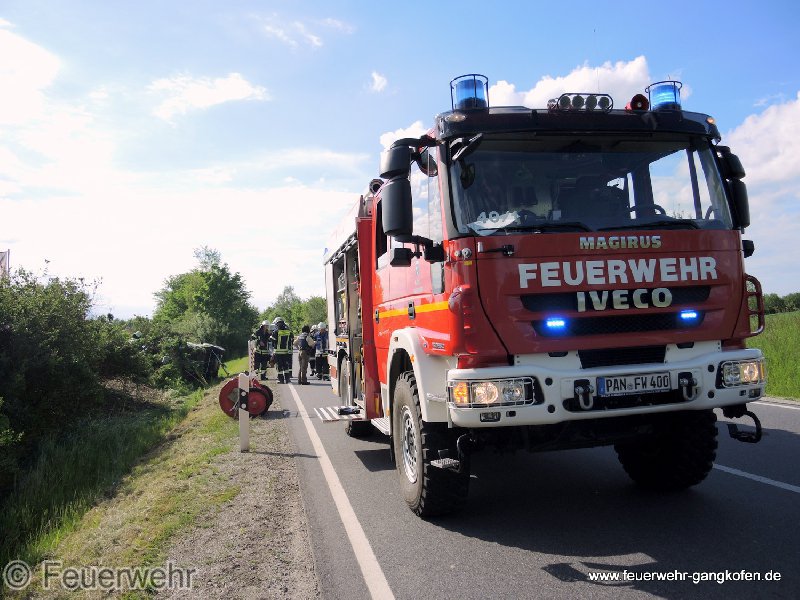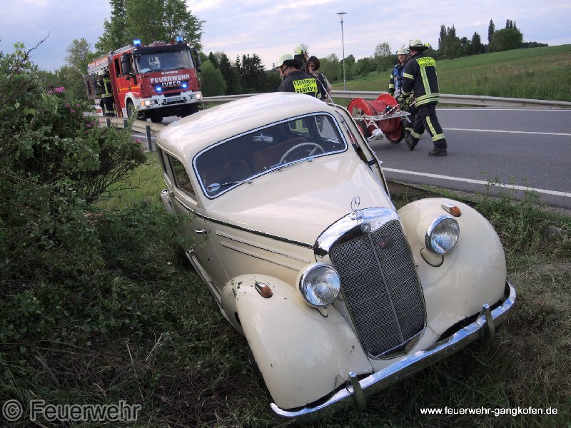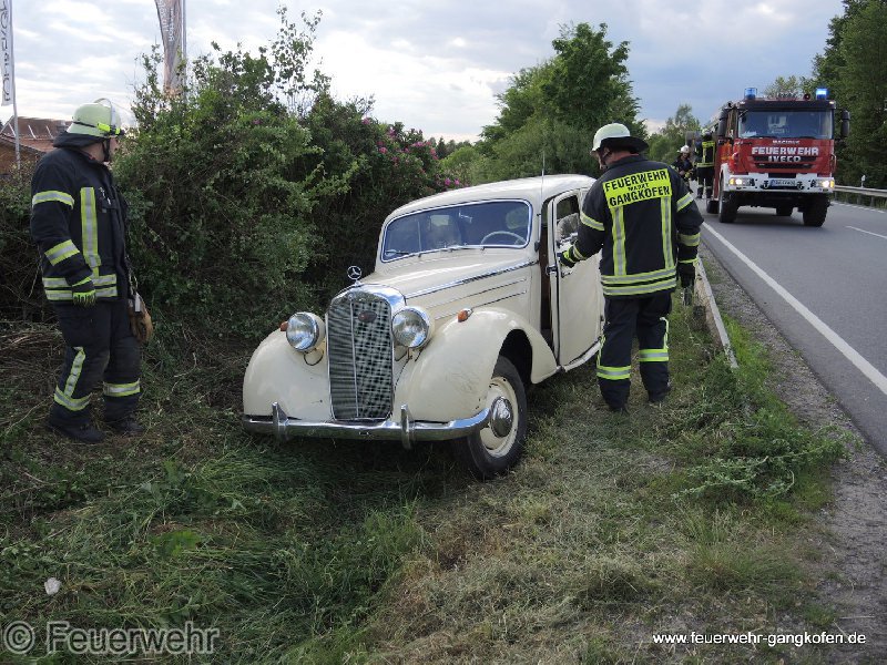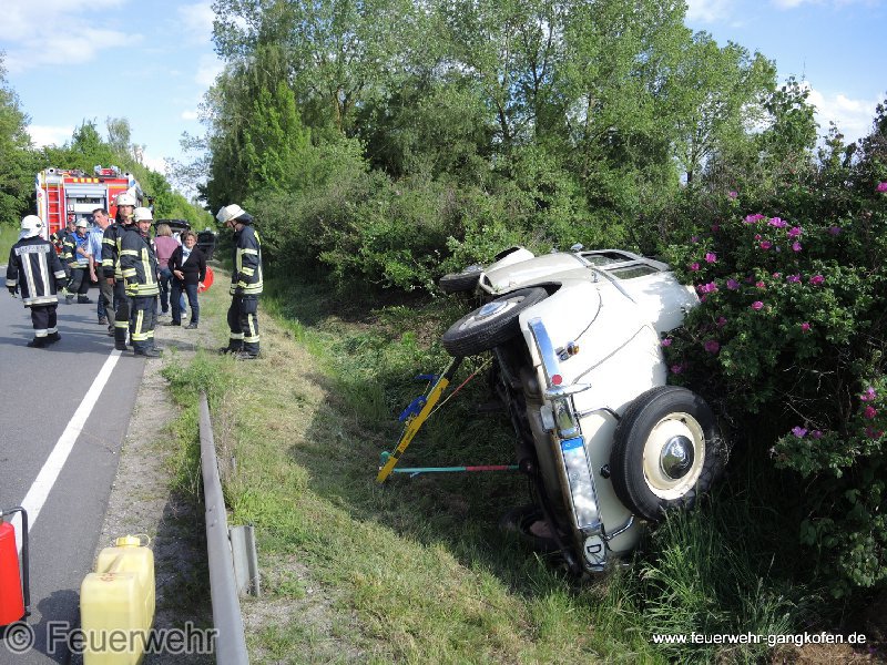 Ein PKW-Oldtimer kam von der Straße ab und überschlug sich. Die FFW Gangkofen band auslaufende Betriebsstoffe, sicherte das Fahrzeug und regelte den Verkehr.