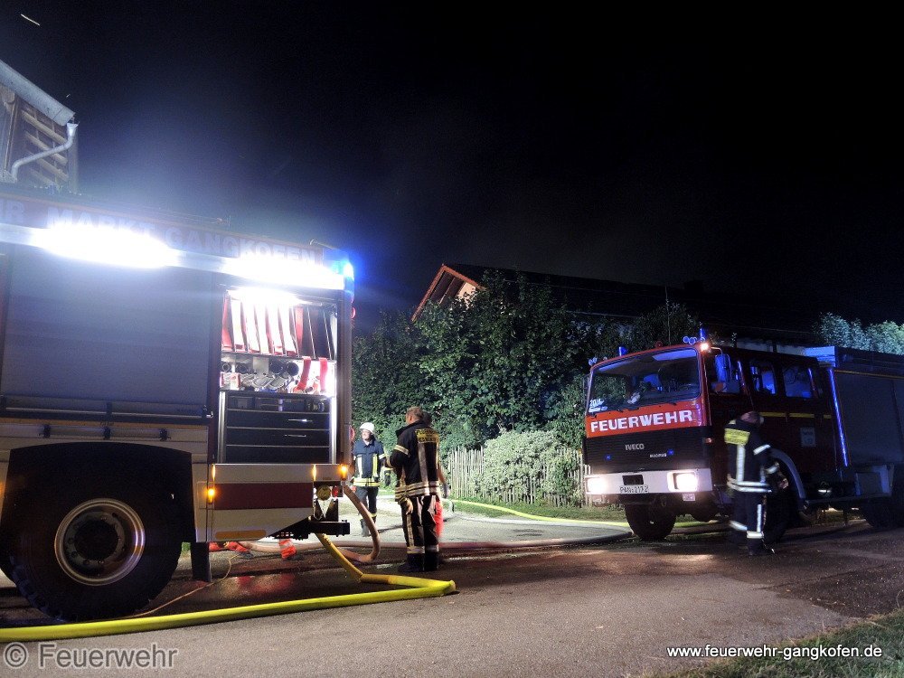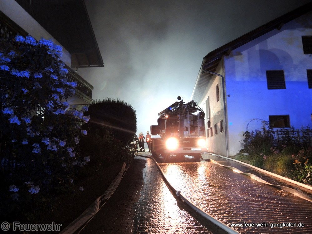 Unsere Aufgabe war dabei der Erstangriff mit den 2000 l Wasser in unserem HLF um das Wohnhaus zu schützen, das Leiten des Einsatzabschnitts "Atemschutzsammelstelle", das Löschen des Brandes über das Wenderohr unserer Drehleiter von oben sowie die Bereitstellung mehrerer Atemschutzgeräteträger.