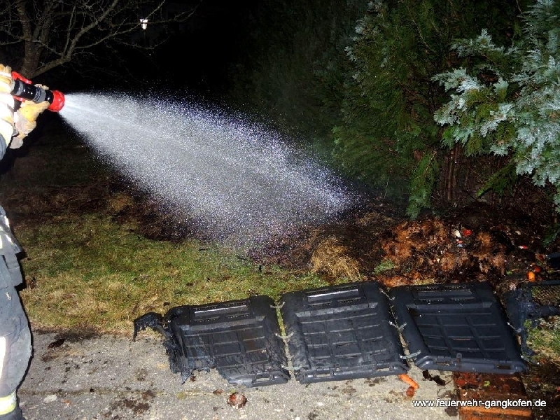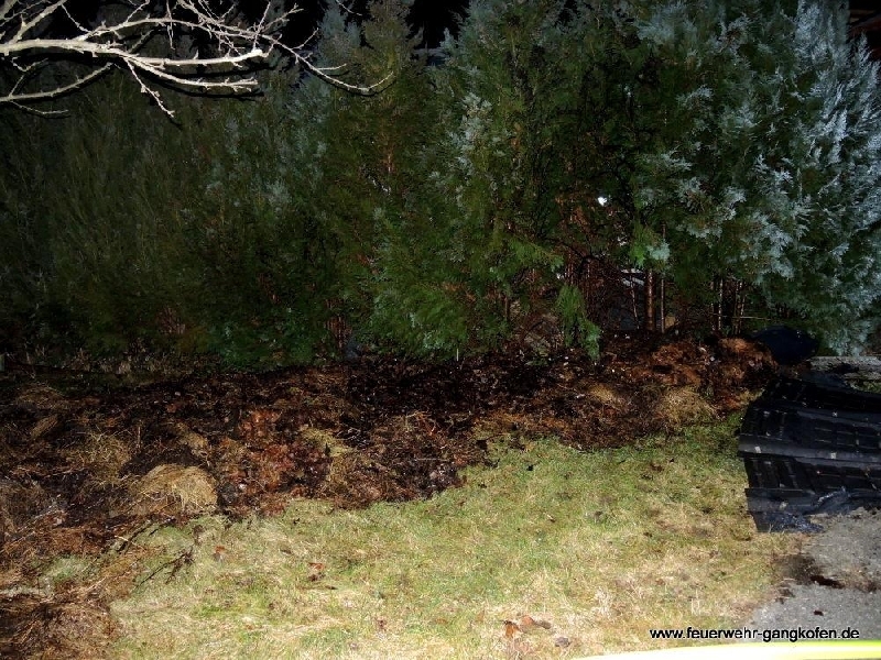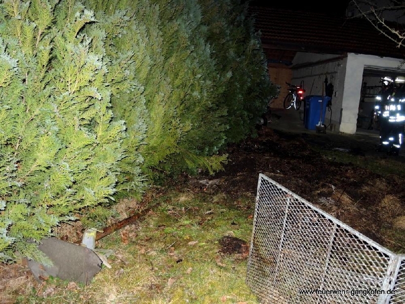 Gemeldet wurde uns ein Heckenbrand in unmittelbarer Nähe einer Garage. Da das Feuer schon sehr früh entdeckt wurde, war bei unserem Eintreffen nur ein kleiner Teil der Thujenhecke und ein angrenzender Komposthaufen in Brand geraten. Deshalb konnte das Feuer durch einen Angriffstrupp unter Atemschutz rasch bekämpft werden. Der Komposthaufen wurde abgetragen, um noch vorhandene Glutnester abzulöschen. Dabei kam auch die Wärmebildkamera zum Einsatz.