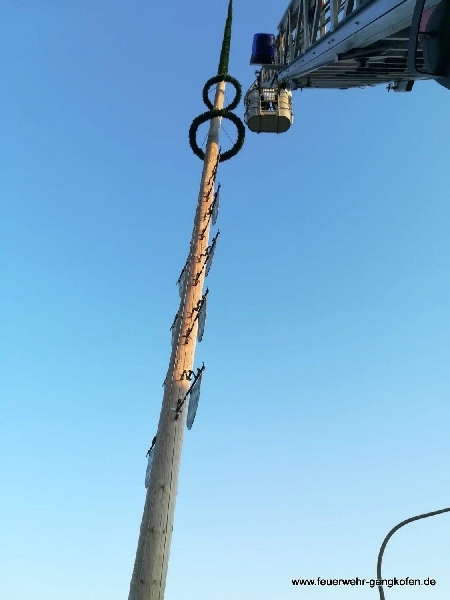 Durch die Witterung und vor allem aufgrund von starken Windböen löste sich an einem Maibaum einzelne Schrauben der Zunftwappen. Durch den Einsatz der Drehleiter konnten am aufgestellten Maibaum alle Schrauben kontrolliert, nachgezogen und ggf. durch längere ausgetauscht werden.