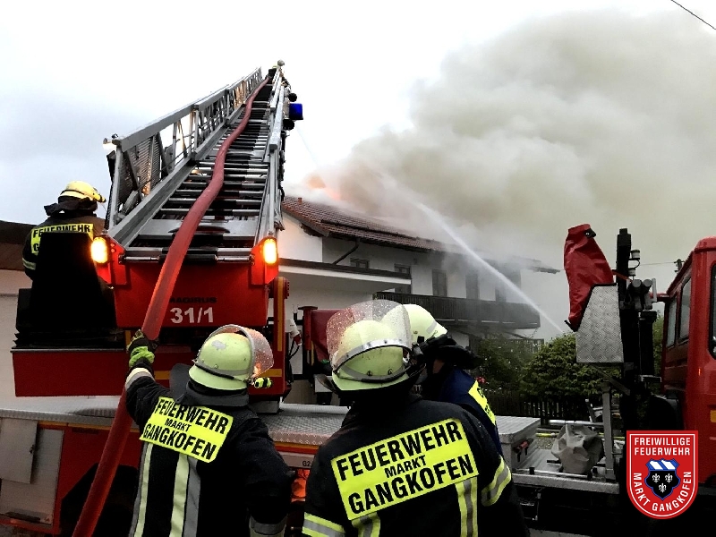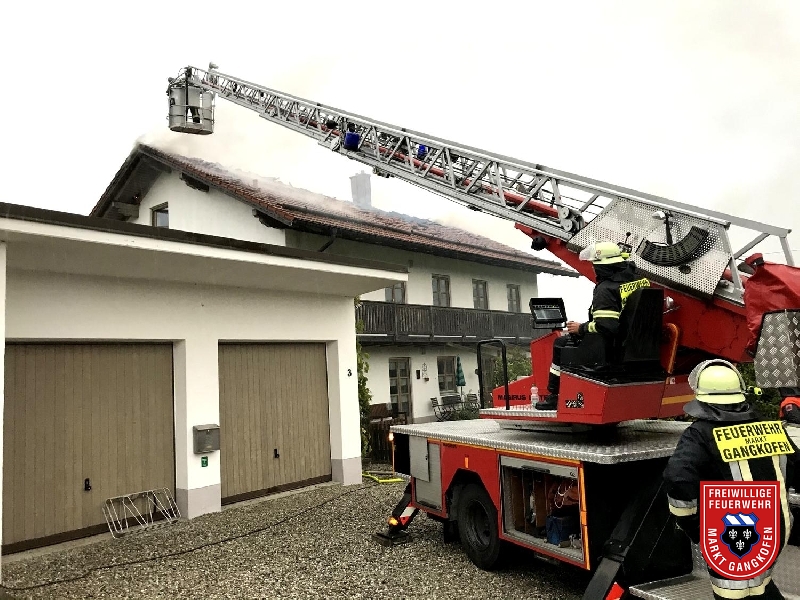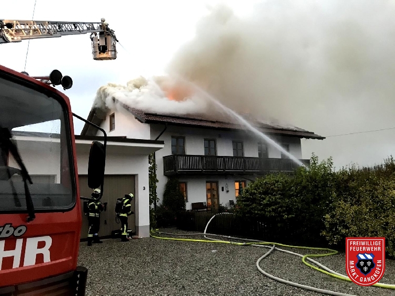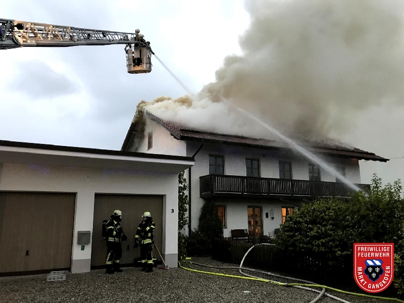 Wir wurden von der Leitstelle Traunstein angefordert, um mit unserer Drehleiter überörtlich zu helfen. Nähe Neumarkt-St. Veit stand bei unserem Eintreffen ein Wohnhaus in Vollbrand. Wir unterstützten die Löscharbeiten mit dem Wenderohr von oben, legten Glutnester unter den Dachziegeln mittels Einreißhaken frei und speißten mit unserem TLF den Wassertank des Neumarkter HLF.
