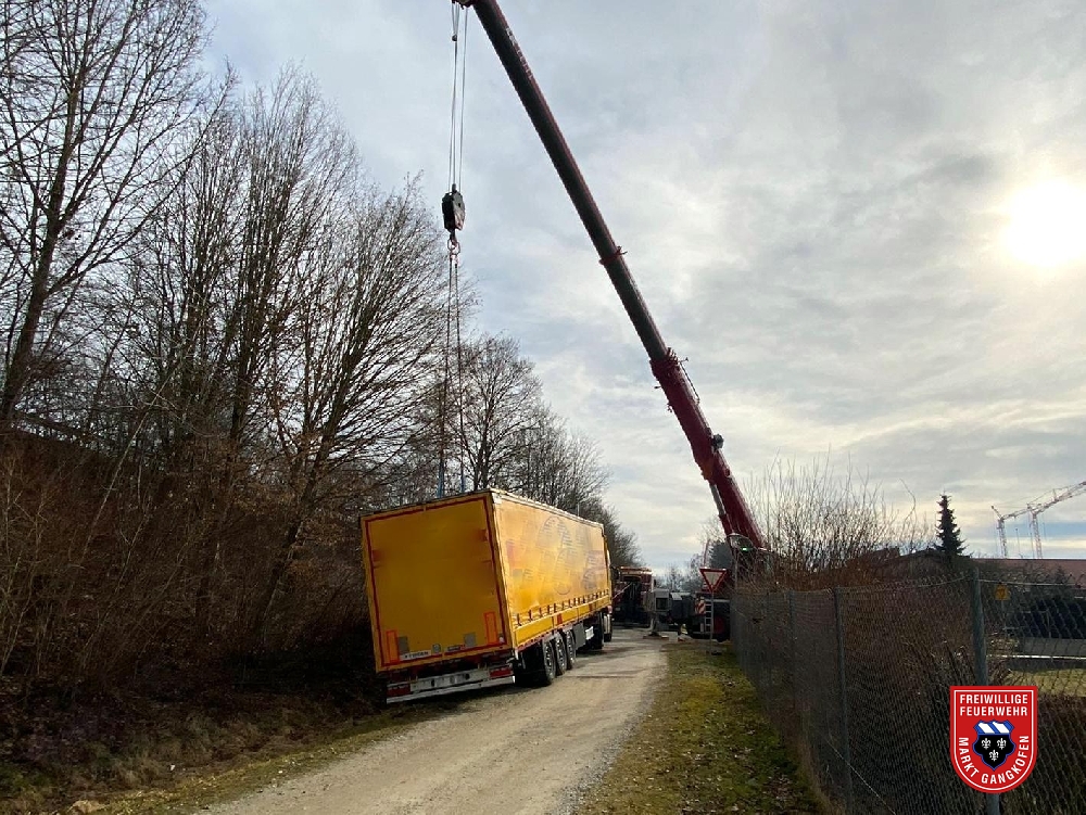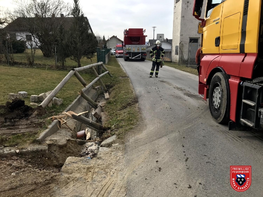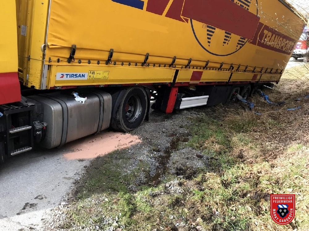Ein LKW hat sich beim Rangieren festgefahren, dabei trat durch die Neigung der Zugmaschine Kraftstoff aus dem Dieseltank aus.