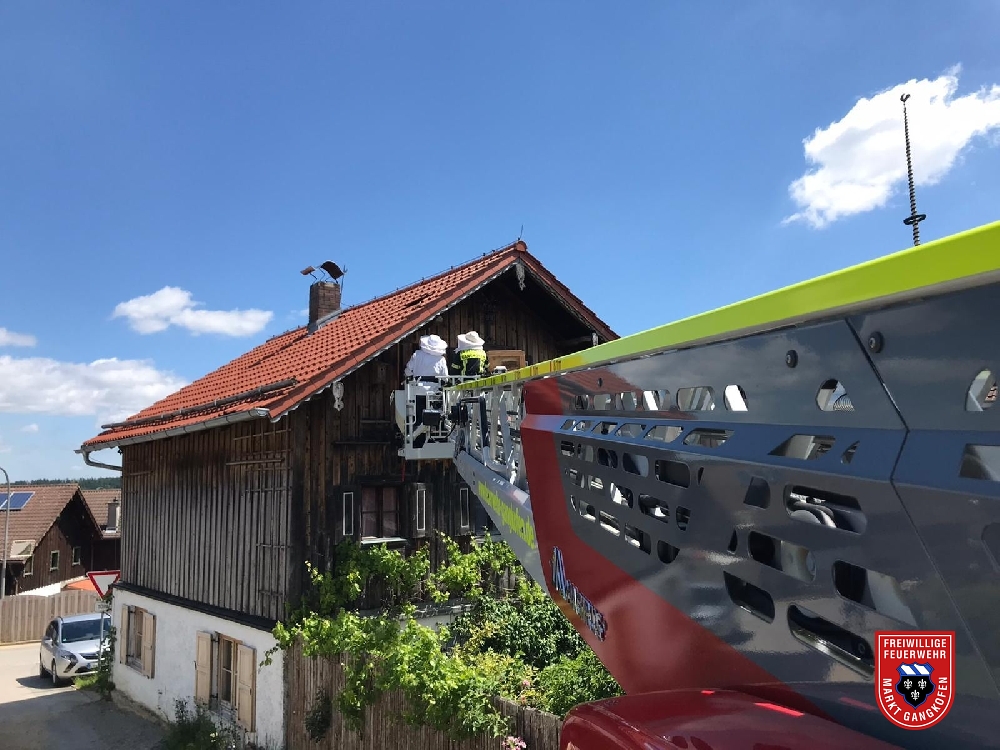 Wir wurden telefonisch angefordert, da sich wohl ein Bienenvolk in drei bis vier Metern Höhe in die Holzvertäfelung eines Hauses eingenistet hatte. Nachdem ein Zugang über das Dach keinen Erfolg brachte, wurde die Holzverkleidung vorsichtig abgenommen und der Bienenstock freigelegt. Durch einen Imker wurde daraufhin der Stock mit der Königin entfernt und umgesiedelt. Anschließend wurde die Holzverkleidung wieder am Gebäude angebracht.