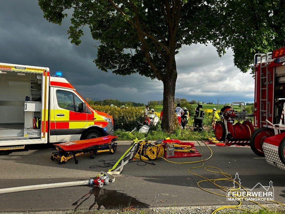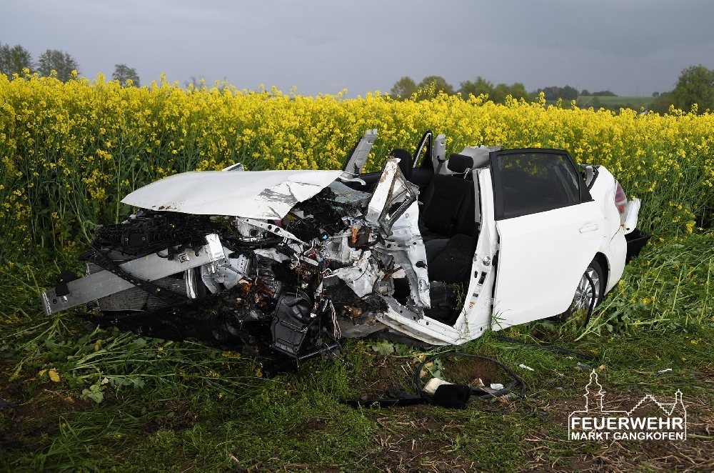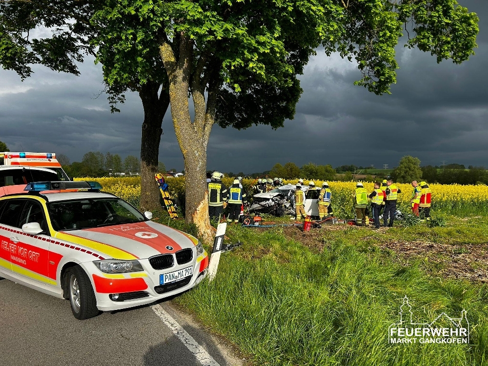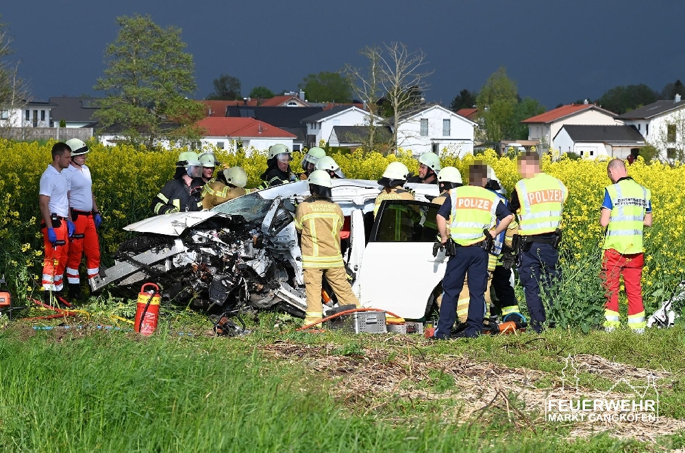 Während der Anfahrt zur Einsatzstelle bestätigte sich diese Meldung. Unmittelbar nach Eintreffen wurde der verunfallte PKW mit Unterbaumaterial stabilisiert, während der Rettungsdienst den Fahrer versorgte. Parallel dazu wurde der Brandschutz sichergestellt. Anschließend wurde für die Personenrettung das Dach des Autos entfernt. Die Rettungsmaßnahmen erfolgten dabei in enger Zusammenarbeit mit der Feuerwehr Massing, welche die Einsatzleitung hatte und ebenso die Verkehrsabsicherung übernahm.