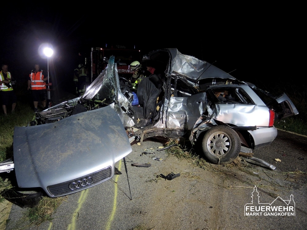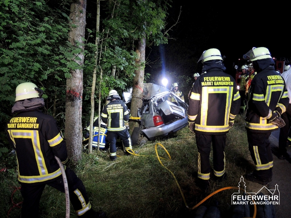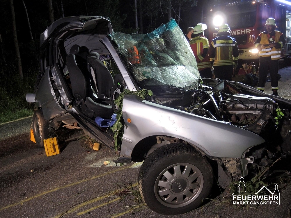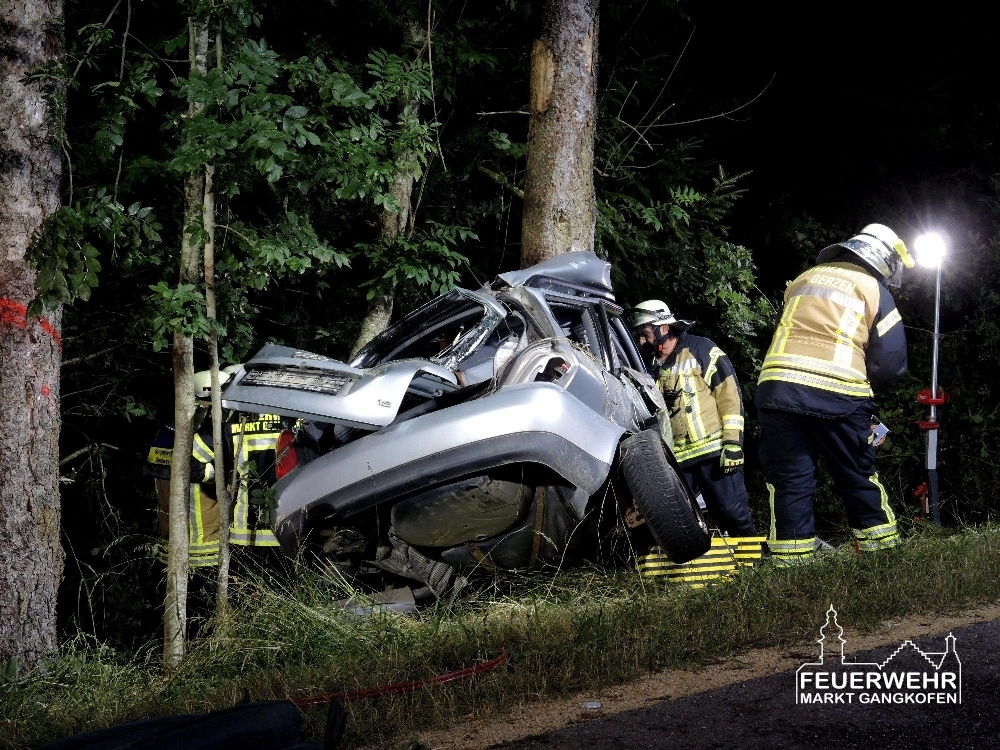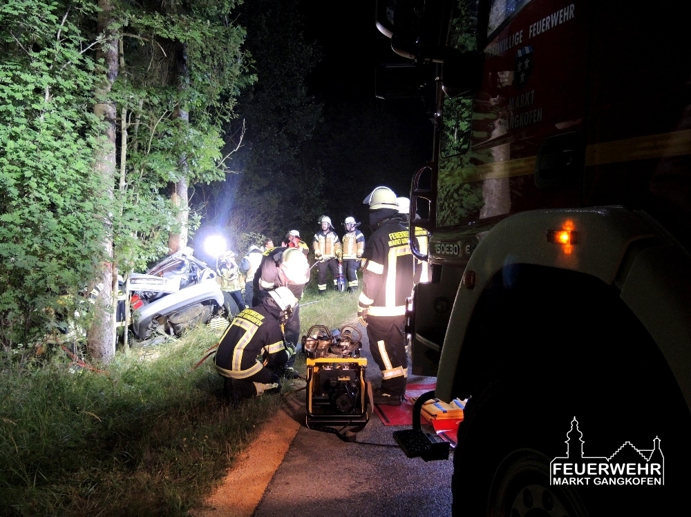Am Donnerstag Abend gegen 19 Uhr wurde unser HLF als zweiter Rettungssatz zu einer Unfallstelle mit eingeklemmter Person in den Nachbarlandkreis Landshut alarmiert. Vor Ort zeigte sich, dass ein PKW mit hoher Geschwindigkeit seitlich mit einem Baum kollidiert ist. Für den Fahrer kam in dem stark verformten Fahrzeug leider jede Hilfe zu spät.