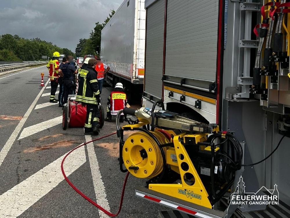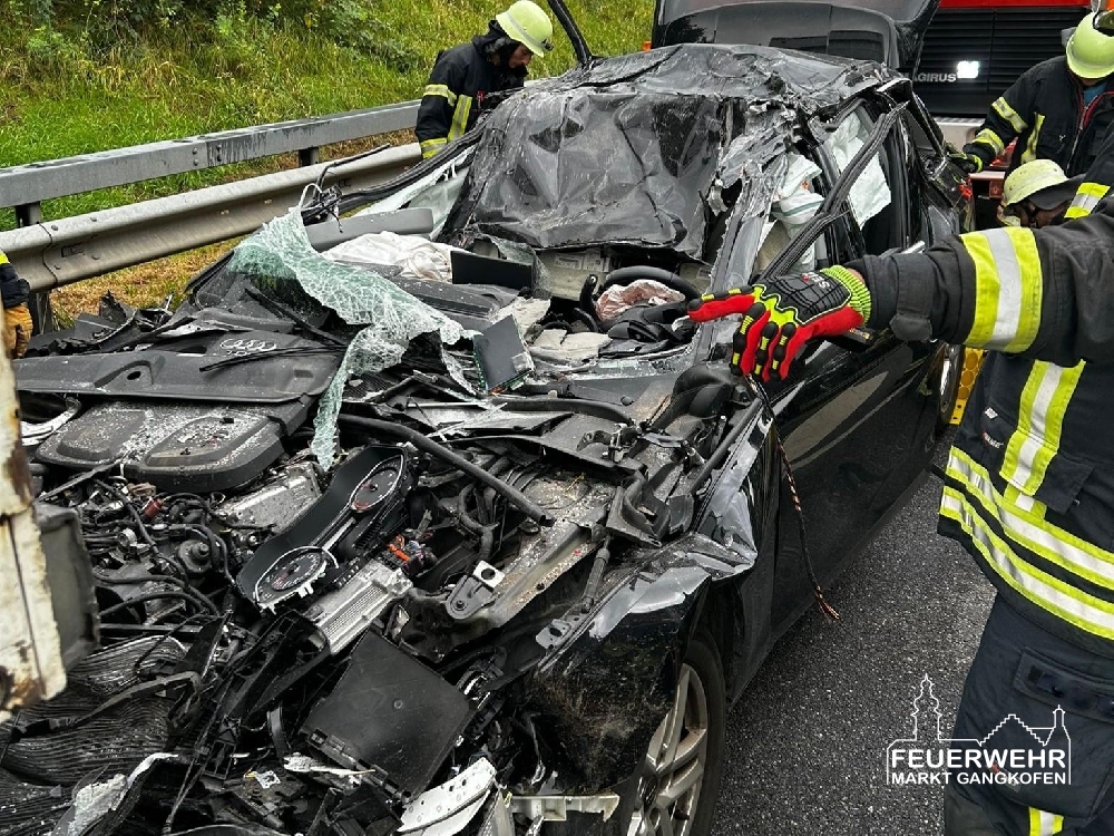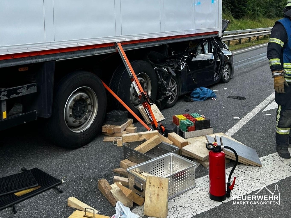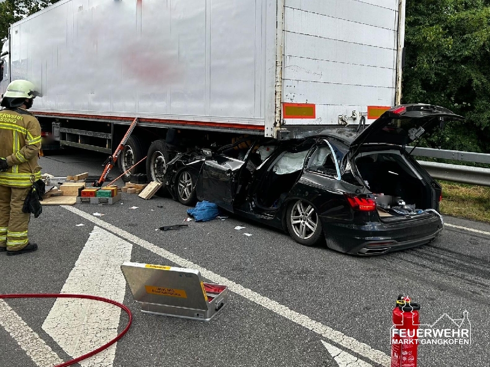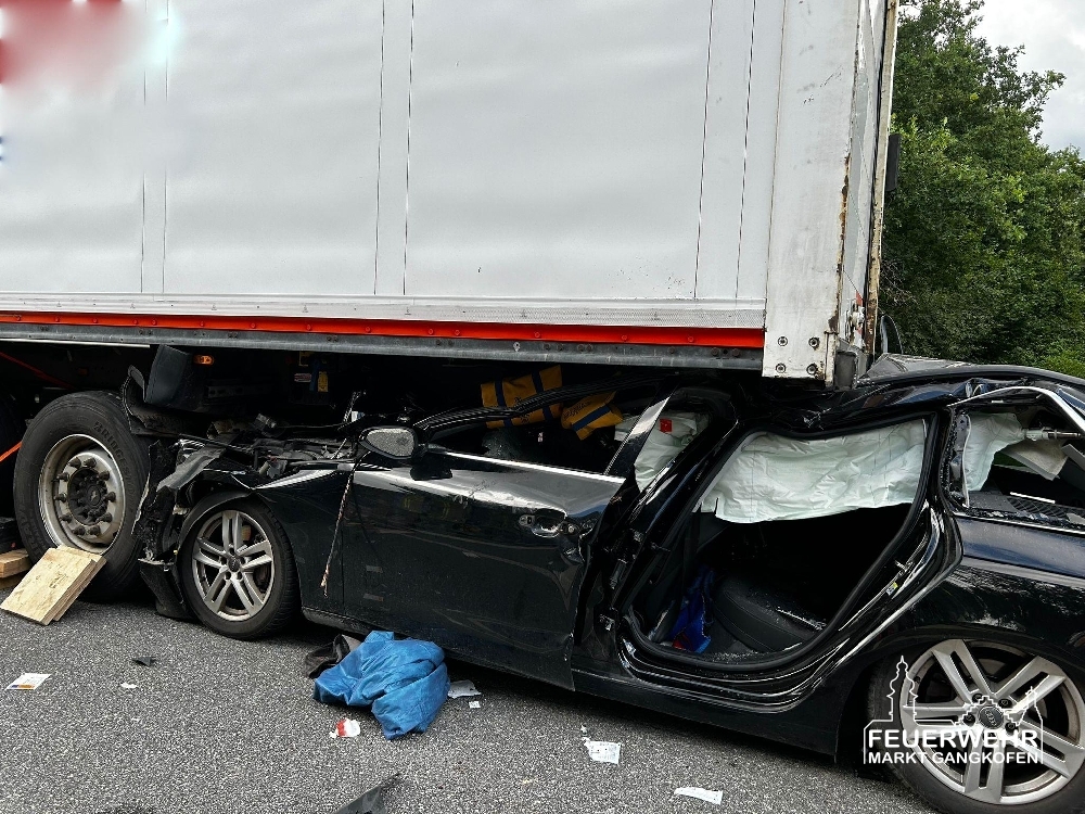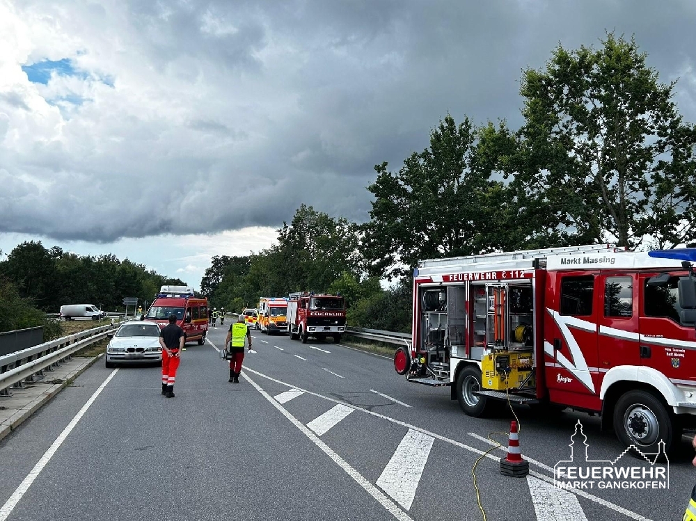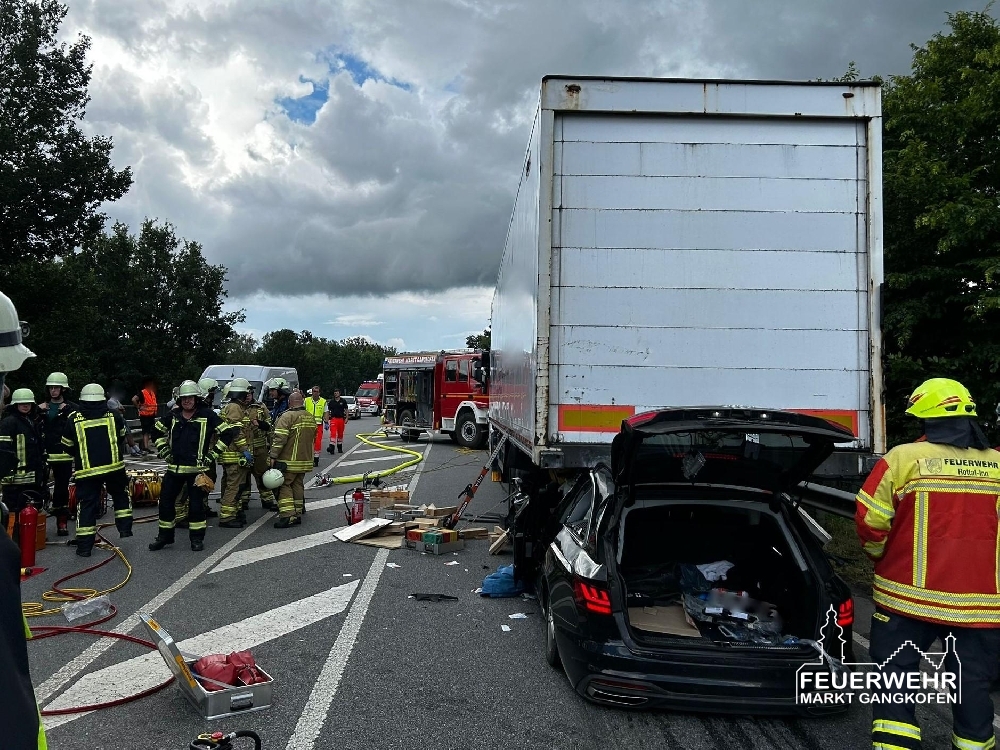 Gemeinsam mit den Feuerwehren Panzing und Massing wurden wir heute Nachmittag zu einem schweren Verkehrsunfall mit eingeklemmter Person auf die B388 Höhe Klorberg alarmiert. Vor Ort zeigte sich, dass ein PKW auf einen Sattelauflieger aufgefahren ist. Aufgrund der vorgefundenen Lage wurde der Rüstwagen der Feuerwehr Eggenfelden, sowie die Feuerwehr Seemannshausen zur Vollsperre der B388 nachalarmiert. Unsere HLF Besatzung konnte durch das Entfernen einer Türe mittels hydraulischem Rettungsgerät den Fahrer zügig aus dem Wrack befreien und an den Rettungsdienst übergeben. Außerdem wurde der Brandschutz sichergestellt, sowie auslaufende Betriebsstoffe gebunden. Letztendlich unterstützten wir noch beim Räumen der Unfallstelle und bei der Verkehrslenkung.
