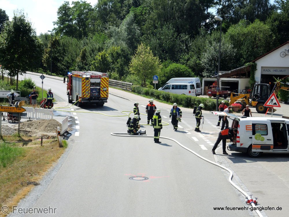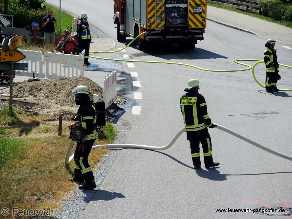Bei Bauarbeiten wurde eine Gasleitung beschädigt. Die Feuerwehr Gangkofen war mit dem Gasspürgerät und zwei PA-Trägern im Einsatz.